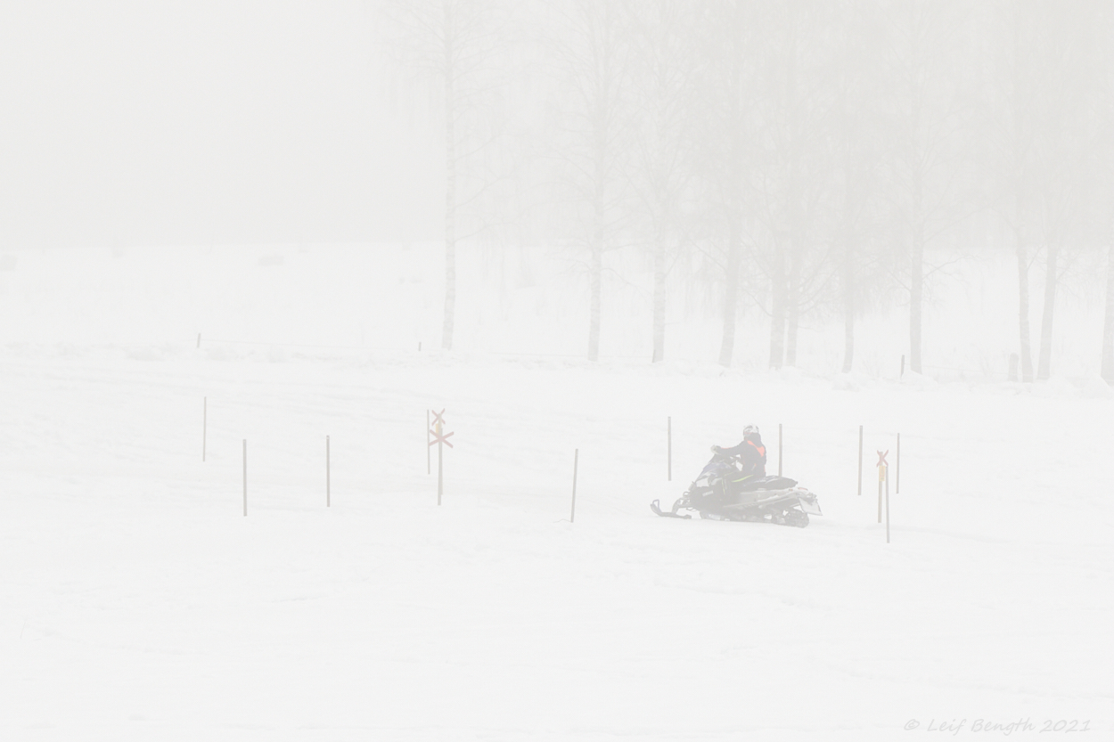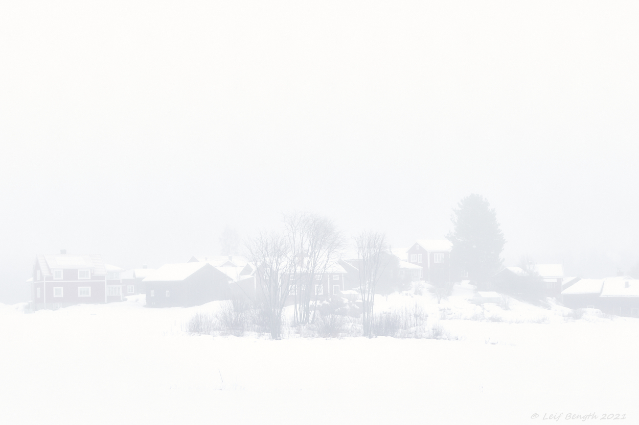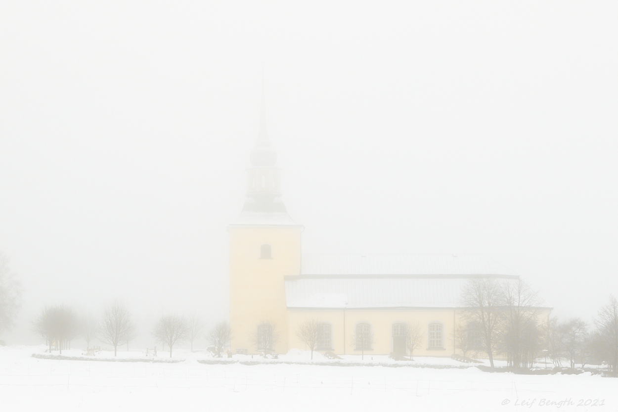 Idag så lade sig dimman tjock över Våmhus. Här bilder på en snöskoteråkare, Våmhus kyrka och på den lilla holbyn Moren strax intill Orsavägen.