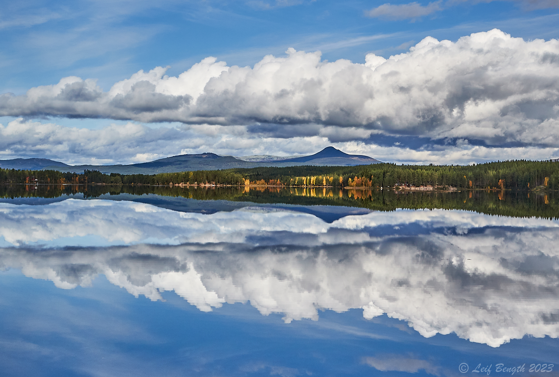 En till bild på Städjan och Idrefjällen speglandes i den för dagen extremt lugna Kringelfjorden. Bilden är tagen strax innan förra bilden men den här från en plats strax intill utan höstlöv i förgrunden…