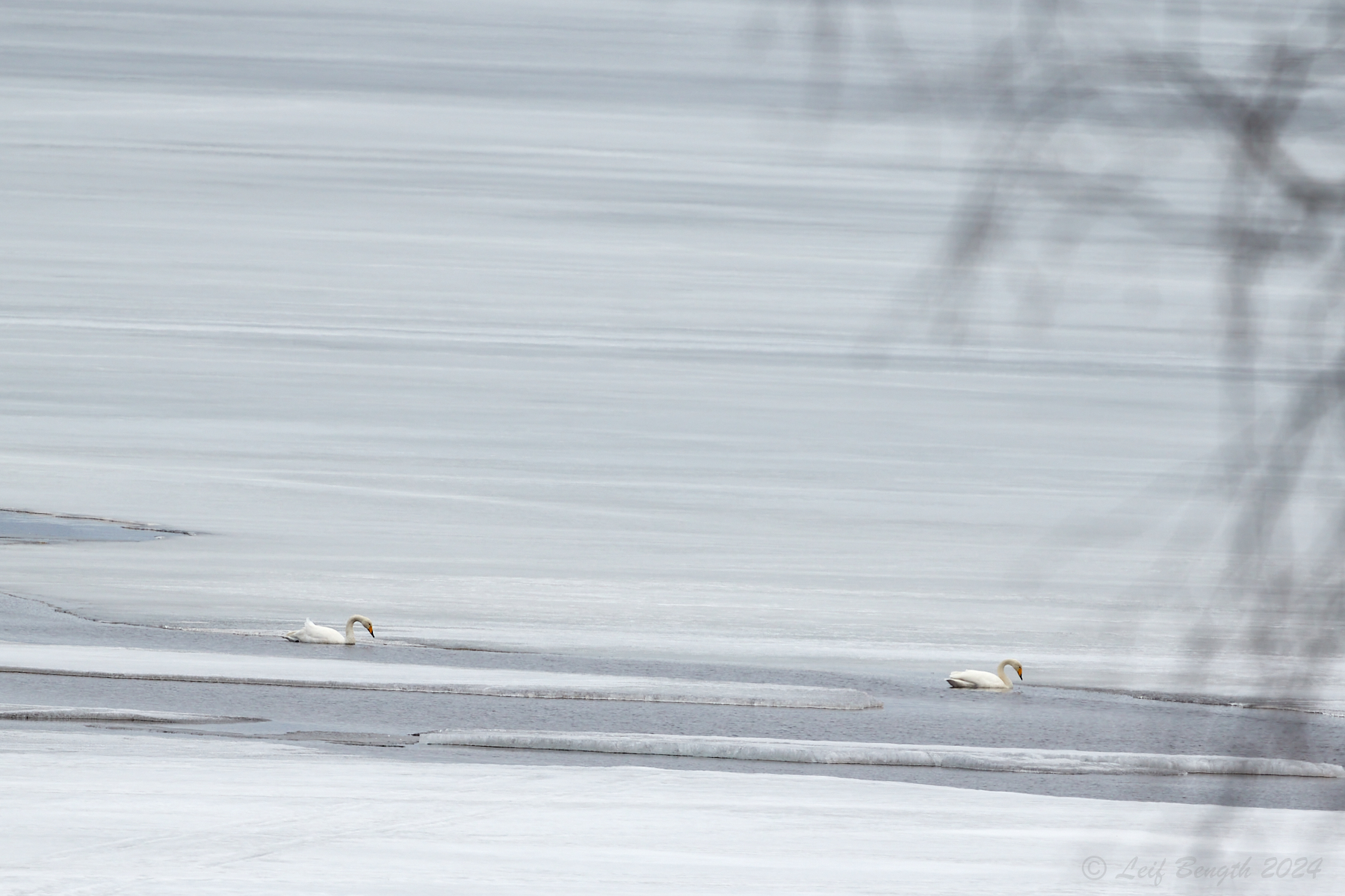 Första paret sångsvan ut på Orsasjön idag i Våmhus. Här simmande och betande i Blåsbäckens bäckfåra som mynnar en bit utanför min dotters hus vid Orsasjön. Det finns säkert fler sångsvanar på Orsasida av sjön, både på land och i öppna vattenytor i sjön även om större delen av sjön fortfarande är täckt av is. De första tranorna har också anlänt och står och betar på de åkrar som blivit snöfria. Några har även setts i Våmhus…