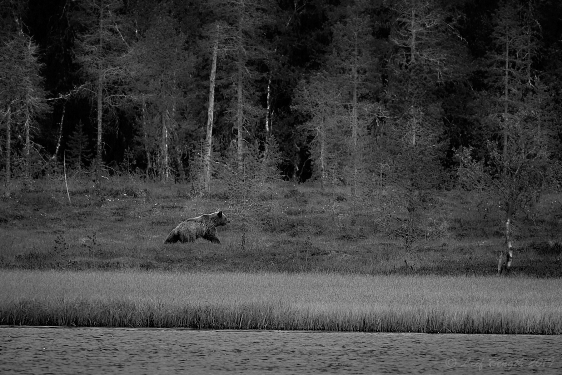 Under ca 15 år har jag bjudit in fotografer till Geddtjenn, både försommar och/eller höst. Denna gång i juni 2019 fick vi under nästan tio minuter uppleva dramatiken då en björn jagade en älgkalv i myrskogarna vid Andjusen. Jag har skrivit tidigare om detta, se relaterat nedan. Här en nyframkallad bild från dramat….
