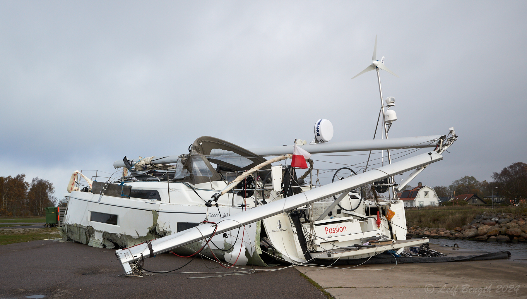 Denna lyxyatch, 40 fot långa Oceanis 40.1, försökte gå in till Grönhögens hamn på Öland i stormigt väder 10 oktober i år. Tyvärr körde den med stormbyarna akterifrån rätt in i stenpiren vid hamninloppet och blev fast där. Motor, köl och inredning lossnade och sjönk till botten med bara skrovet kvar på piren. Alla sex ombord klarade sig. Här en bild på den bärgade båten som nu ligger på land i hamnen. Runt 300.000 Euro i sjön…