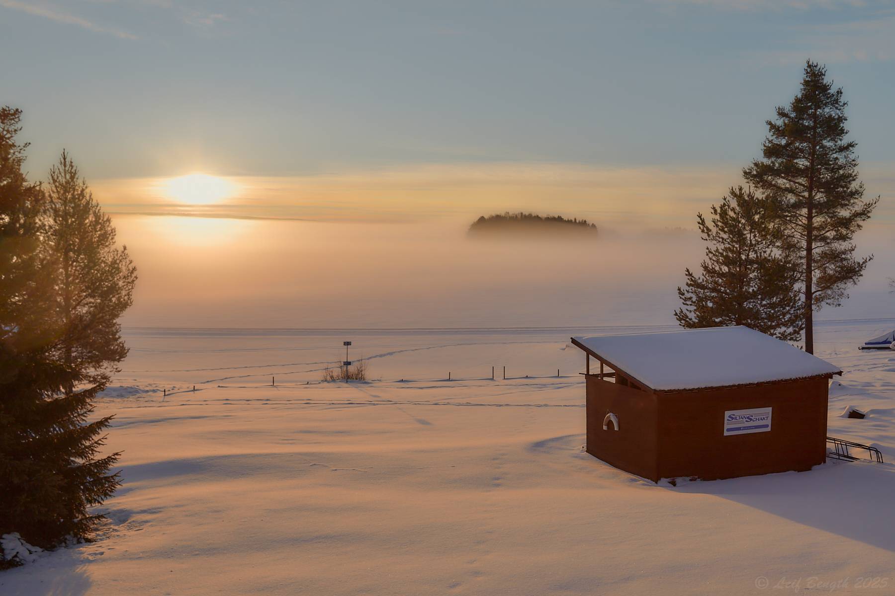 I morse blev det äntligen en tur med kameran efter en dryg månads uppehåll under den mörka tiden då det mest handlat om att digitalisera diabilder. Nu när dagarna börjat bli ljusare och solen börjar värma igen känns det skönt att komma ut i det fria med kameran. Speciellt som idag så dimmorna lågt sköna och mjuka över Orsasjöns is. Här en bild tagen vid badstranden vid Bäcka då solen var på väg att ta sig upp över de mjuka morgondimmorna…