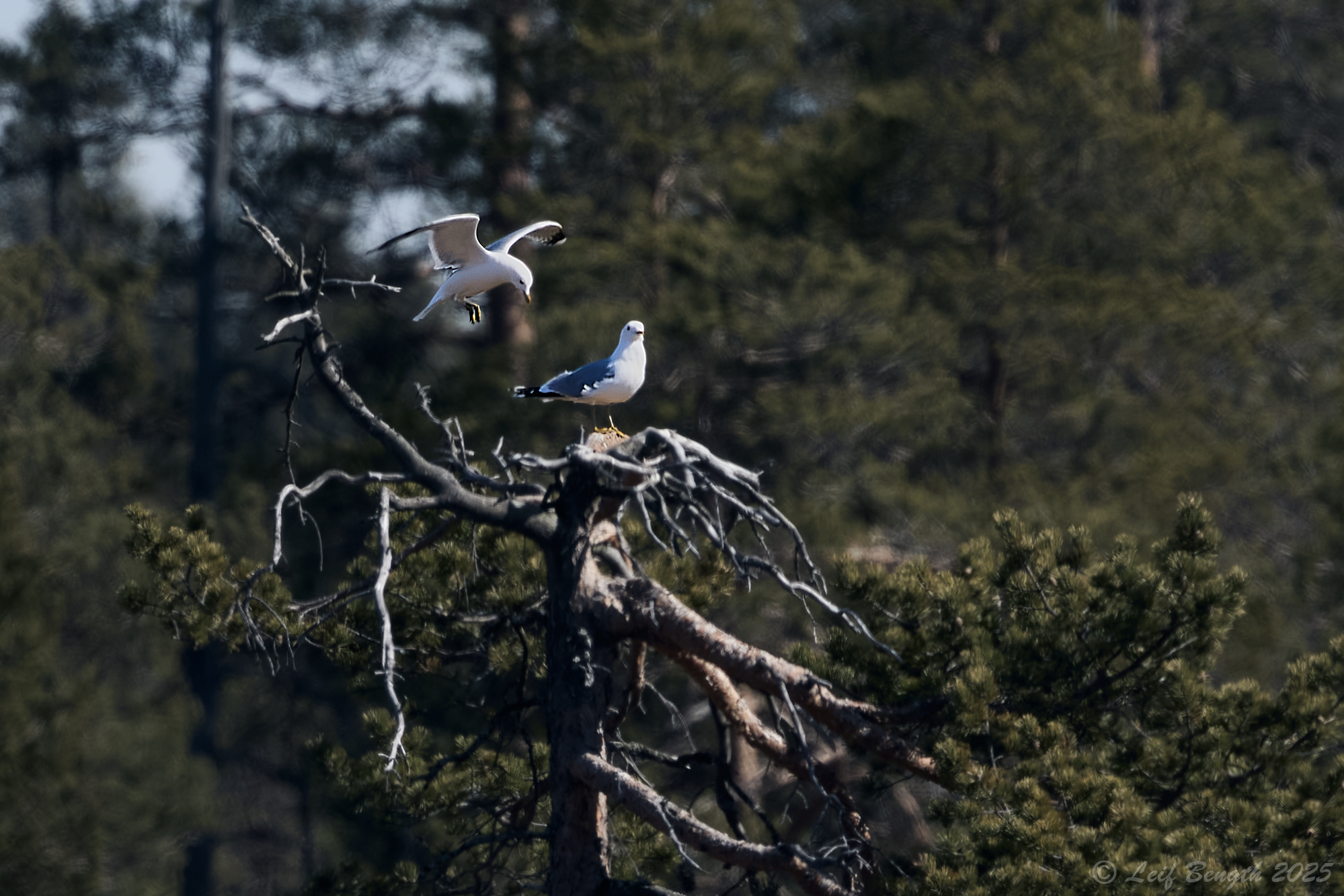 Helgen före 1 maj blev det åter ett besök på Våmhuskölen ett dygn för att kolla in livet och tranorna ute på myren. Tranparet såg ut att må bra där de fridsamt gick omkring. De har ill och med fått sällskap av ett par fiskmåsar som verkar ha slagit till i en torr talltopp på myren. Det blir säkert fler besök där under våren…