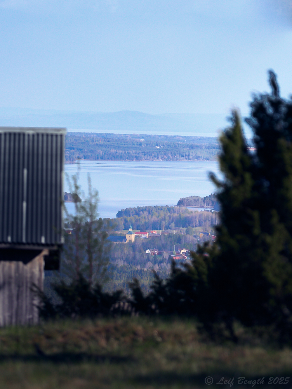 Näsbergs fäbodar ligger mellan ca 400-430 möh i skönt söderläge i bergen norr om Våmhus, som ligger på ca 180 möh. Från i stort sett alla fäbodstugor kan men se samhällena och bergen runt Orsasjön och delar av Siljan. Här en bild på Våmhus kyrka sedd från täkten med ett uthus och en enbuske i förgrunden. I bakgrunden syns Orsasjön och Siljan med de blånande bergen ner mot Leksand och Siljansnäs bortom Sollerön…