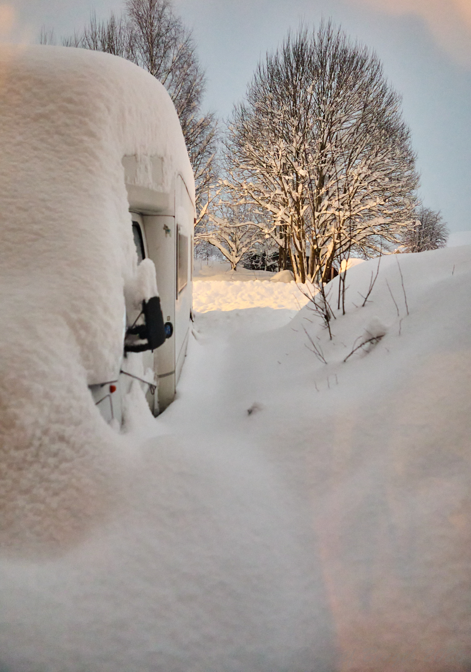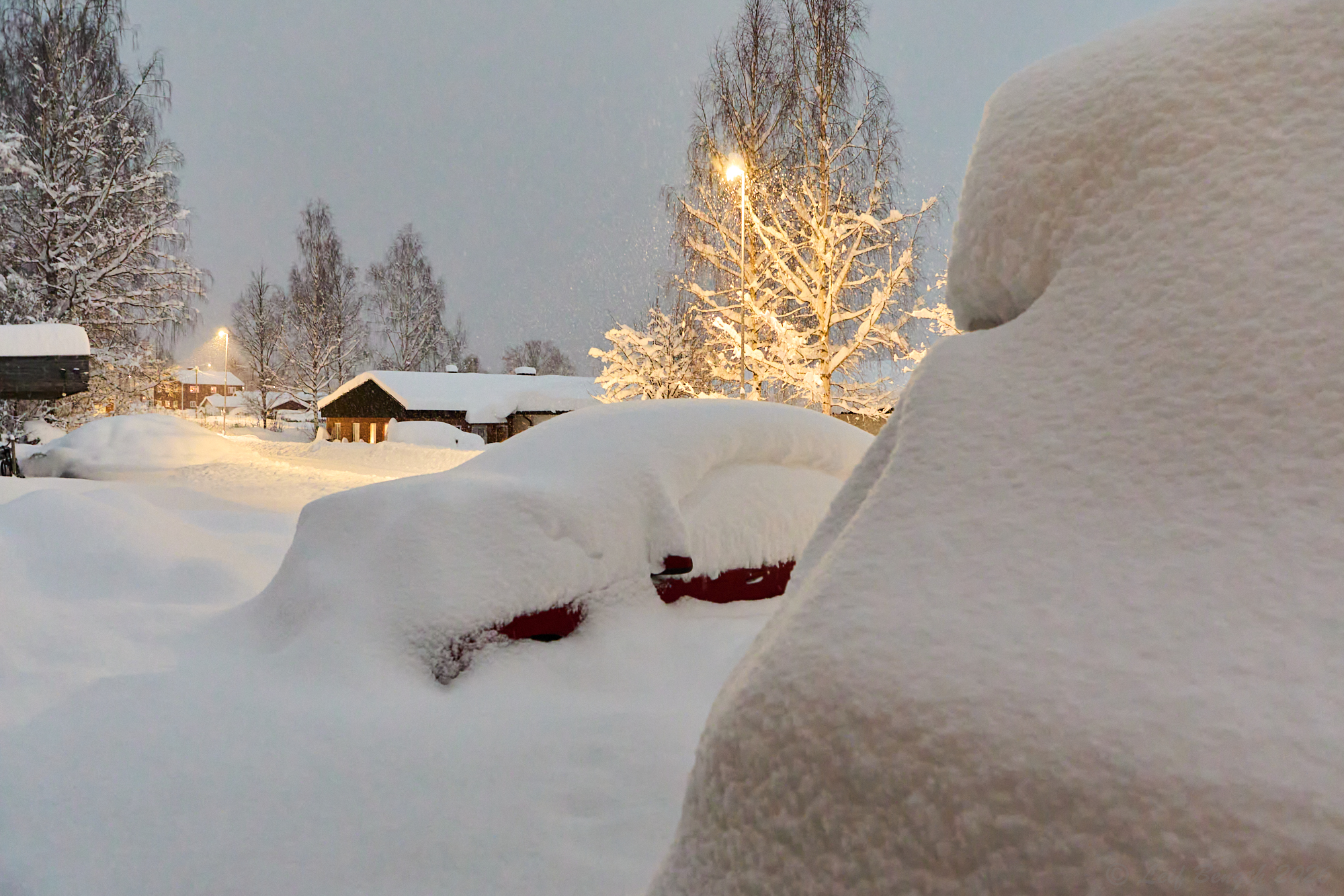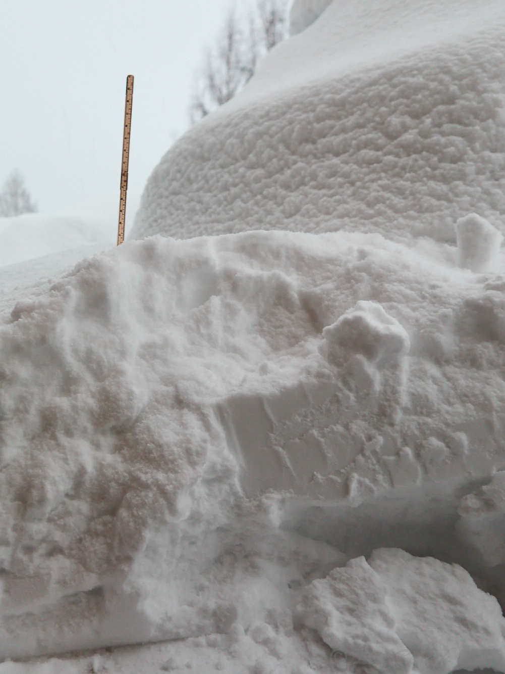 Lade ifrån mig kameran och tryckte till med kroppens tyngd och fick upp dörren så att jag kunde komma åt snöskyffeln och skotta rent lite vid dörren. Stack ner en tumstock för att kolla snödjupet – lite drygt 60 cm utanför dörren. Nästa blir att försöka komma åt bilen och få undan snöplogskanten och bilen ut på vägen…